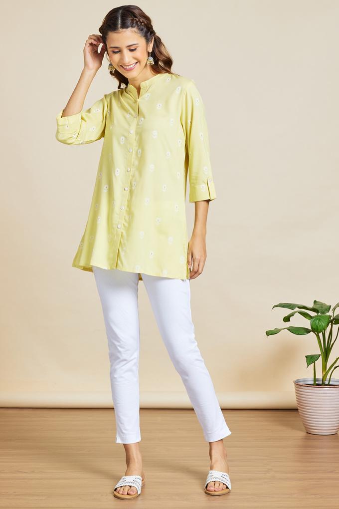Buy HAUTE CURRY Yellow Printed Rayon Mandarin Women s Casual Wear Very well made.